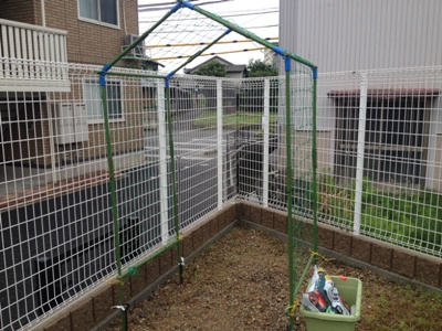 お子さん達の為に園芸が出来るようにと、事前に用意されていた園芸用のゲートをお客様御家族と一緒に組立です。