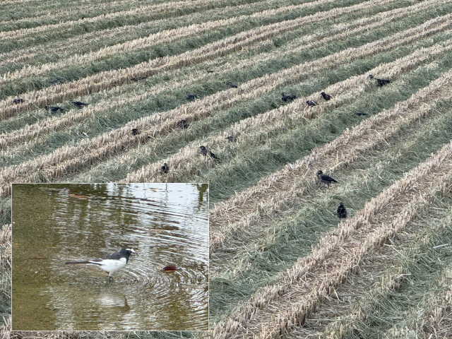 稲刈りのあとを、今朝は小さな鳥さん達の団体が落ち稲拾いのごとく一生懸命に地面をつっついていました。