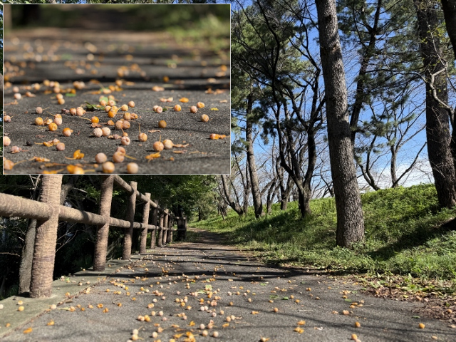神戸町のばら公園いこいの広場から大垣市内へ続く輪中堤の道での銀杏並木の道に落ちている銀杏の実は、今年は非常に少なくなった感があります。