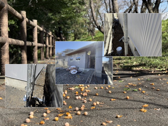 現在は家造りの現場の敷地を囲うように仮囲いの仮設設備が残すのみとなっていて、台風の接近対策の高所の足場養生シートの解体は必要無くなっている状況。