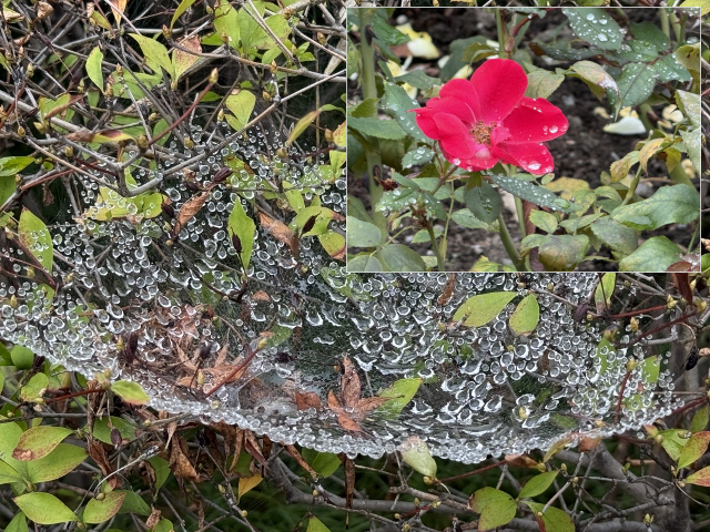 今朝からの雨で神戸町のばら公園では蜘蛛の巣に雨しずくが溜まり、ばら園の草木にも雨粒の化粧がされていました。