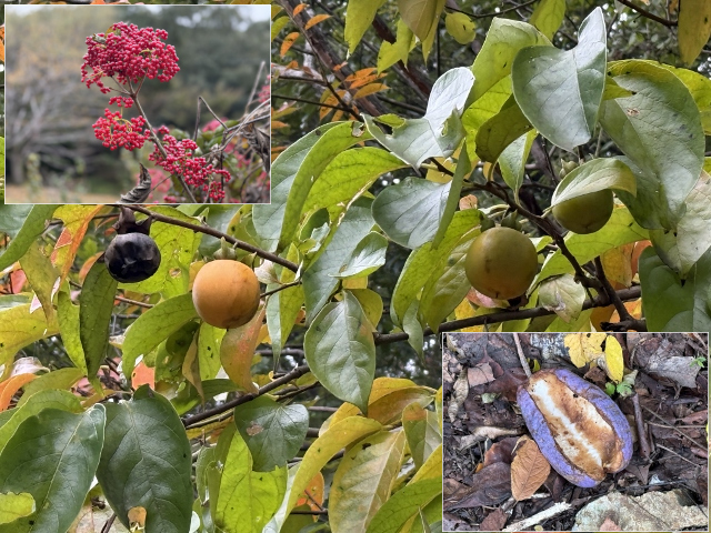 雨が降る前にと、過ごしていた「ながら川ふれあいの森」の薬木の広場から三田洞展望広場までの道では、曇り空の下でしたが各所で晩秋の実りが見ることが出来ました。