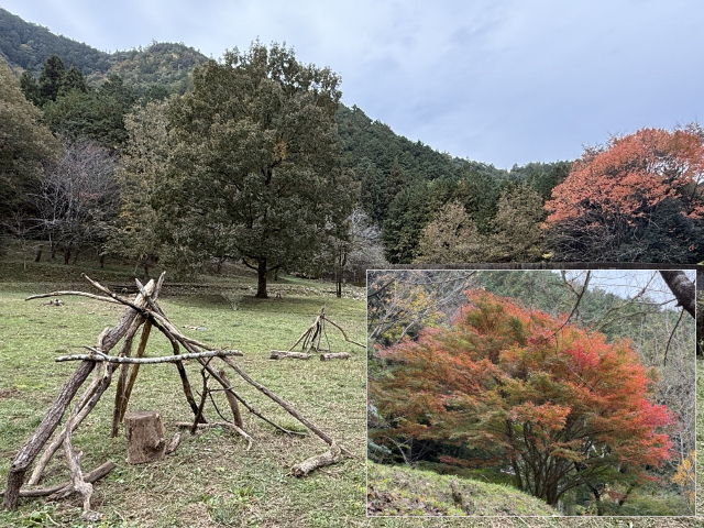 子供達が築いたであろう木の枝のテントを中心にするように次第に紅葉が薬木の広場を囲うように樹々が彩づいてきています。