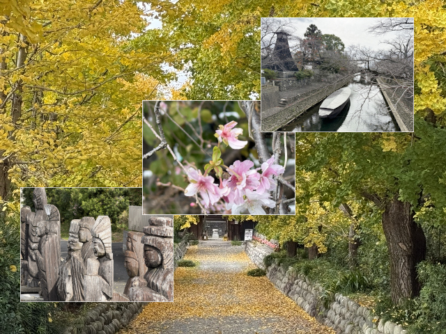 本来なら秋の風景となっている銀杏並木、冬の始まりとなる寒桜の花、紅葉が終わってすっかり落ち葉も落ちた水門川通り。