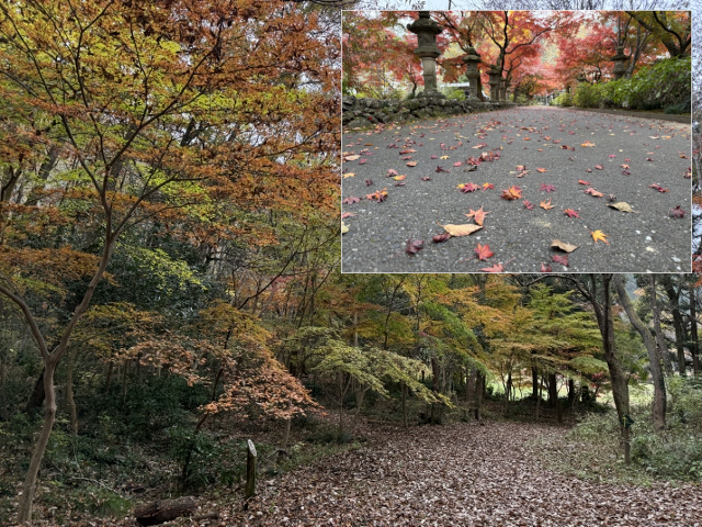 既に落ち葉でいっぱいになっている”ながら川ふれあいの森”内の道ですが、周辺の赤く萌えた紅葉の葉も今日で雨で落ちるのを早めています。