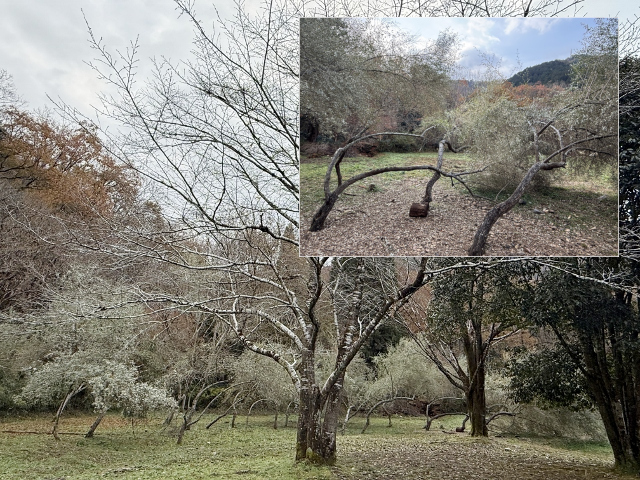 特徴的な倒れ方をしているオリーブの木?(と思う)は、まさに寒さにふるえているかのようにも見えます。