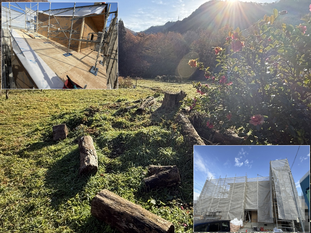 今日も師走の暖かな陽射しに恵まれた上棟工事の翌日の幸せ家造り工房の一級建築士の建築家の家造りの活動です。
