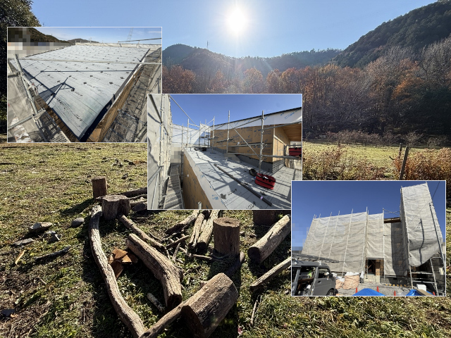 工事中の新築住宅の屋根と外装部で工事が進むなか、幸せ家造り工房は一級建築士の建築家の設計監理者としての仕事はもっぱら現場掃除。