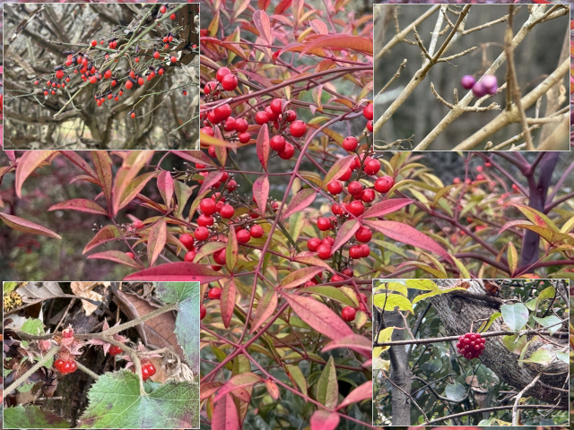 南天の実、ムラサキシキブ、ニシキギ、フユイチゴ、サネカズラ・・・。