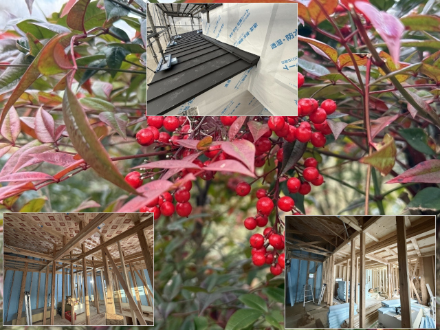 WB HOUSEの新築住宅工事は、下屋部屋根の壁際換気装置の工事も完了して屋内の断熱材の施工と共に外装部の第一通気層の為の工事工程が始まります。