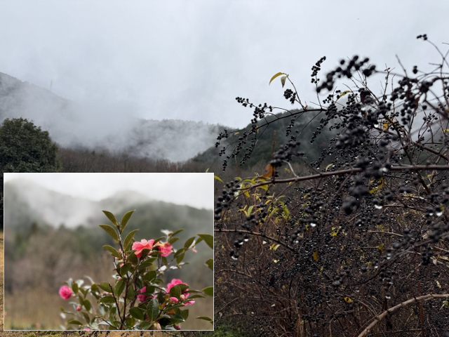 薬木の広場になっているナツハゼの実やサザンカの花には雨雫が滴っています。