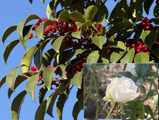 多くの薔薇の花は蕾の状態のばら公園は、赤い実の季節を迎えたクロガネモチの樹々で彩られていました。