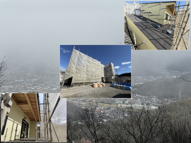 家造りの現場内の外部足場や建築資材の養生等の確認と補強。