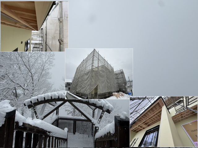 WB HOUSEの新築住宅を囲う外部足場の上には雪が残っていません。