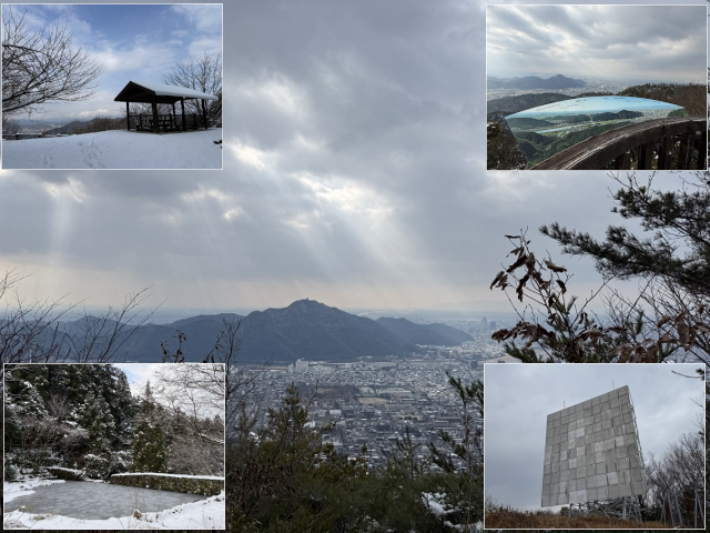 地表が見え出した薬木の広場から氷に閉ざされた桜の広場の鯉の池、三田洞展望広場を経由して百々ケ峰展望台までの登山道はいつものコース。