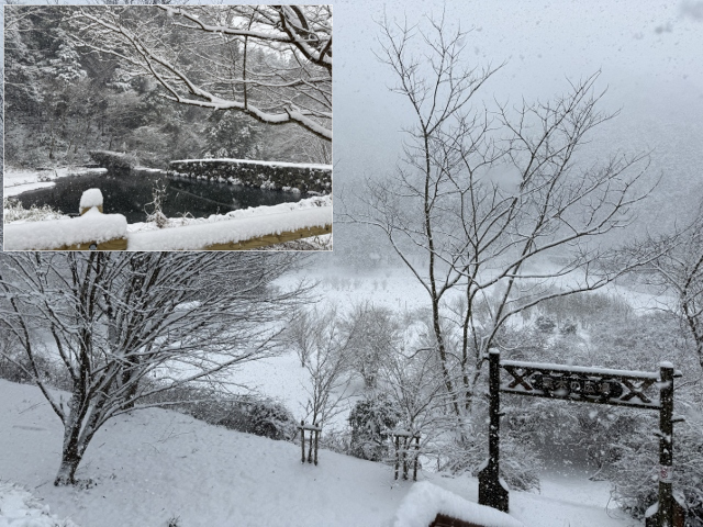 ながら川ふれあいの森でも薬木の広場から桜の広場の池までの管理道路での移動中は牡丹雪が激しく降っていましたが、山道に入ると途端に雪が降るのが終わったように・・・。