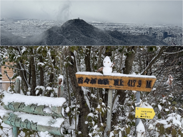 今日も先に登山されている方々によって作れた雪ダルマが飾られていた百々ケ峰展望台の広場。