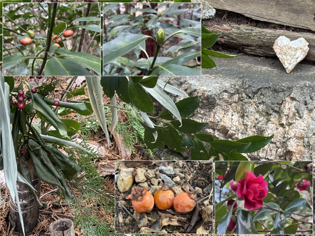 百々ケ峰までの山道で見る冬の恵みの山子柿や山茶花から彩付いたアオキやまだ名前のわからない蕾へと変わってきました。