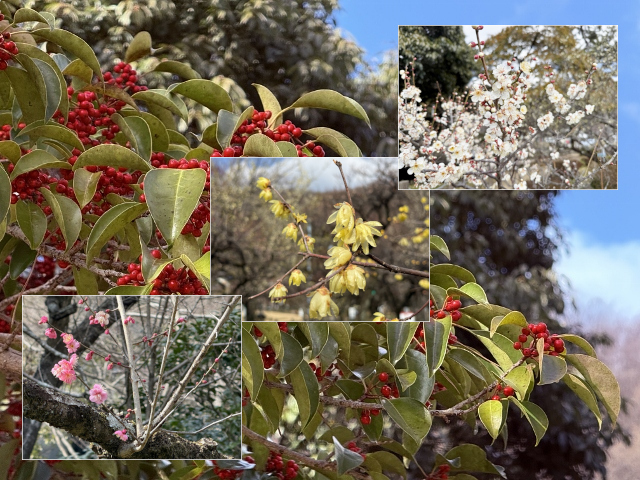 たわわに赤い実を実らせたモチノキと共に梅林公園の蠟梅や梅の樹々の花が3分咲きでしょうか?