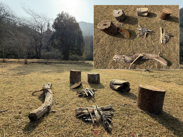 額崩れの光景とは反対に三田洞駐車場横の”ながら川ふれあいの森の薬木の広場”では、今日も訪れた人々力作がありました。