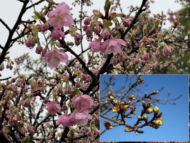 一昨年の2024年の今日の2月21日は雨の中でも河津桜の花が咲き出していましたが・・・。
