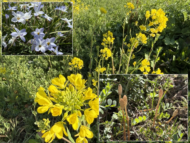 道路と菜の花の境の土手を見ると小さな春の植物を見つけました。