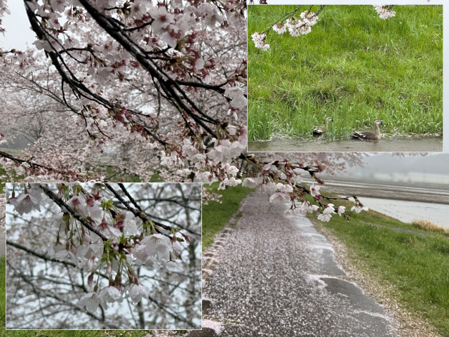 今日の雨で満開を迎えていた桜の花の多くが散ってサイクリングロードの道に広がって雨水に流されていました。