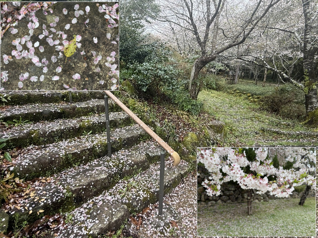 どちらの桜の名所の桜の樹の周囲には雨で舞い散った桜の花弁が広がり、靴に桜の花弁が一緒にくっついてきて自動車の中まで運んでしまう状態。