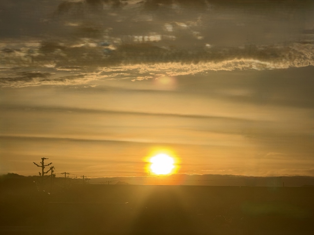 幸せ家造り工房の事務所へむかう東の空には大きなオレンジ色の太陽が見えて、