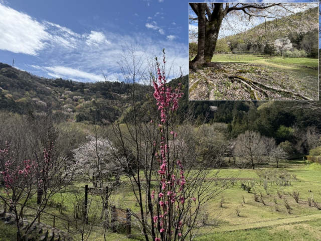 空の青空と共に白や濃いピンク色の桃の花や紫のミツバツツジの花、葉桜に変わろうとしている山桜などの花々が、百々ケ峰の山を彩り、