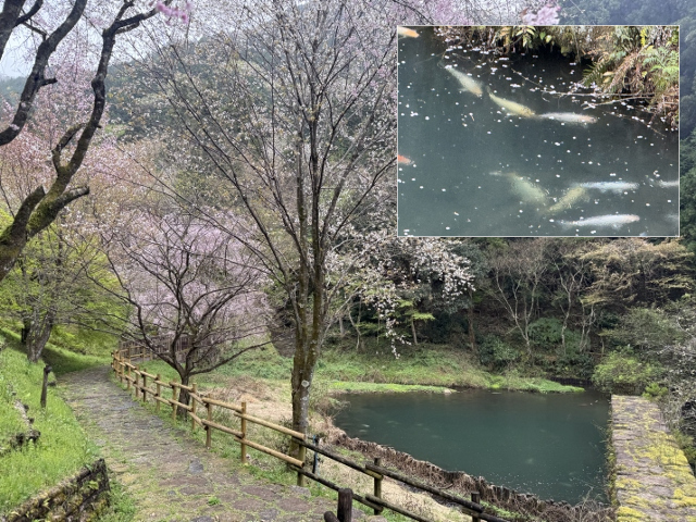 桜の広場の池にも鯉さんが泳ぐ水辺の上には桜の花弁が浮かんでいました。