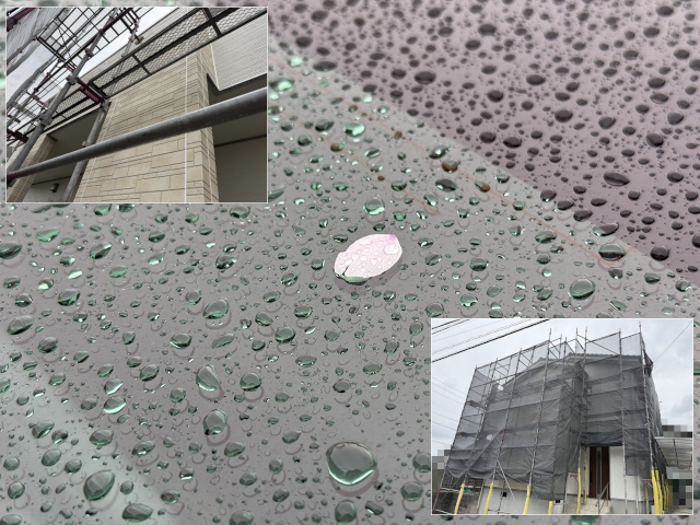 現在は屋外高所作業の為の外部足場が組まれて、外装部の高圧洗浄工事が施工された状況となっています。