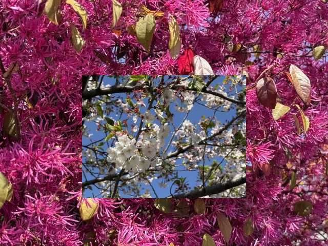 岐阜市内の市街地の様子は、葉桜の風景からベニバナトキワマンサクやジューンベリーなどの春の花の庭先の風景となって、