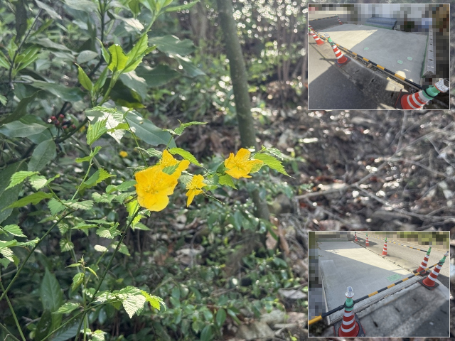 百々ケ峰へ登る山際からは春の嵐の名残のように山水が激しく流れ落ちています。