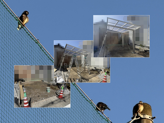 昨日に外構工事の施工業者さんが駐車場土間コンクリートの為の鋤取りと型枠組、測量による墨出しをした敷地内で、その墨出しに合わせてエクステリア業者さんによるカーポートの組立設置工事が実施されました。