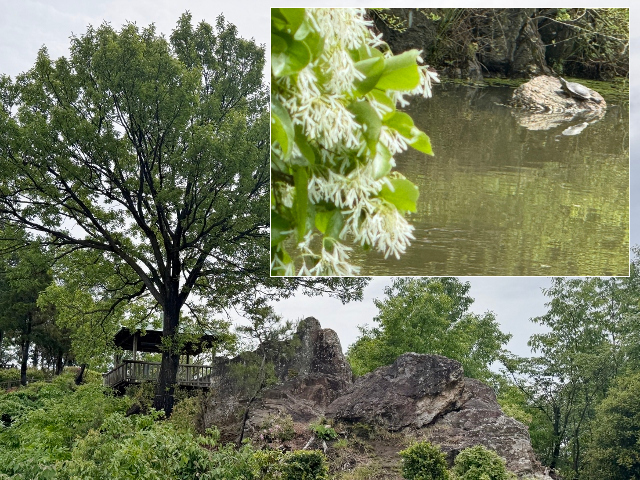 ナンジャモンジャの木の下とはいきませんが、対岸の池岸の岩には今日も亀さん達の姿がある日でした。