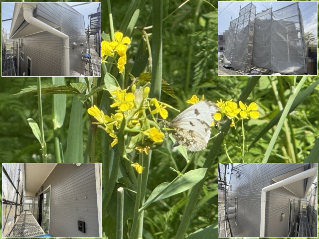 幸せ家造り工房はいつものごとく、外部足場に昇って高所の上から地面に接した下でまで施工状況の点検と検査の記録です。