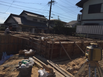 基礎業者さんが、数多くあるアンカーボルトの一本一本を正確な位置に固定をして、測量機器のレベルで設置高さも測定をして、高い施工精度で施工を進めていきます。